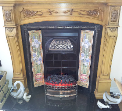 We needed a recess for cast iron frame to sit into, so had to make cut into new plasterboard. As this recess is not deep enough to take a traditional fire back, we tiled rear of fireplace where it sits on wall with 4 inch black tiles with black grout, and placed granite hearth in place. Hubby then had to cleverly craft two new legs for base of surround as this was too short to sit on hearth once in place on tiled fireplace. Once these additional legs were stained and waxed and fixed in place, we bought an electric fire with coals effect for glow feature only (no heat).